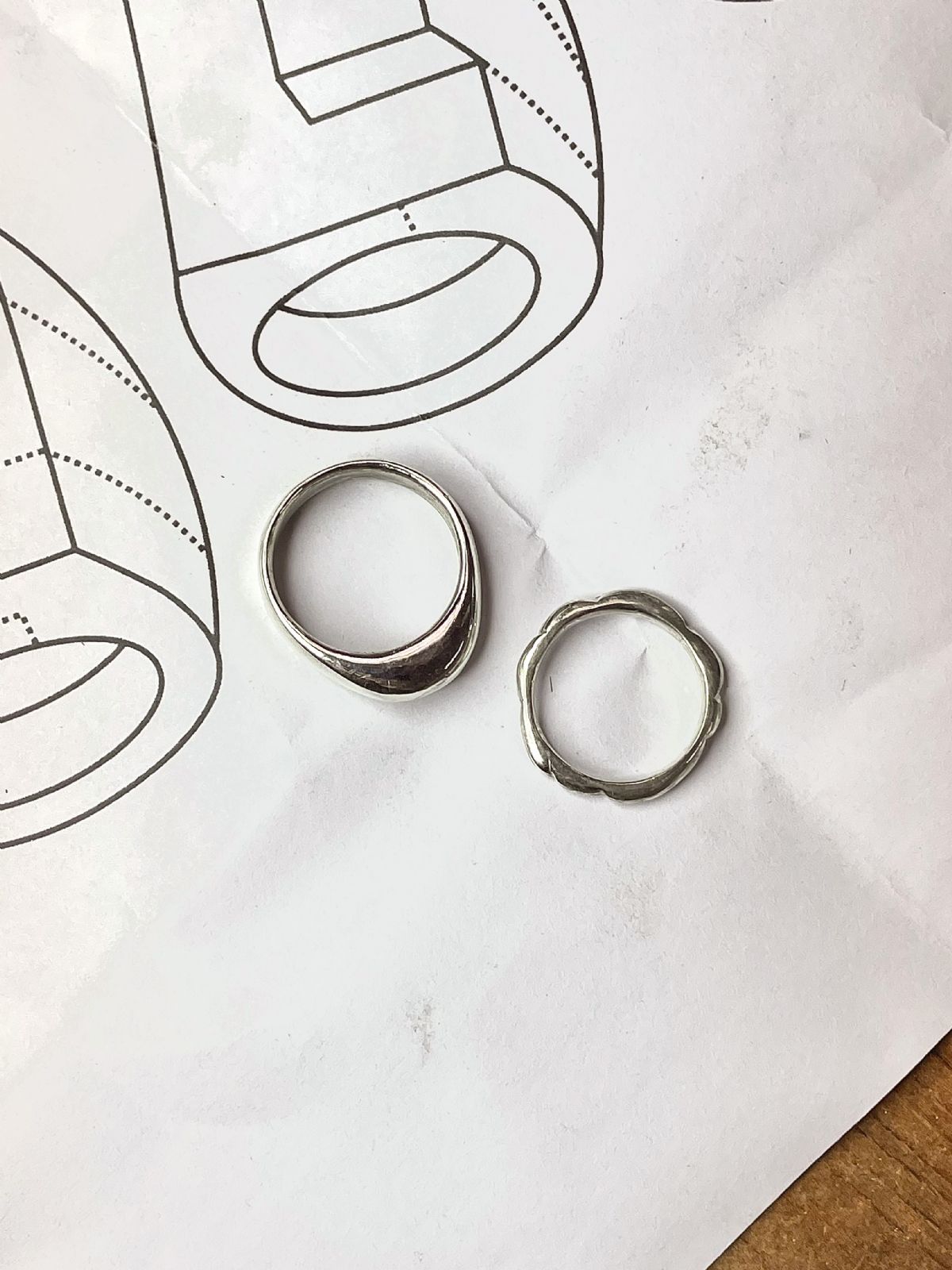 簡介課程綱要、⾦⼯教室與⼯作安全須知。認識脫蠟鑄造(Lost-wax casting)、蠟材與蠟雕⼯具介紹。介紹基礎戒型、學習戒圍測量與基本鋸切,製作印章戒、幾何戒。 |