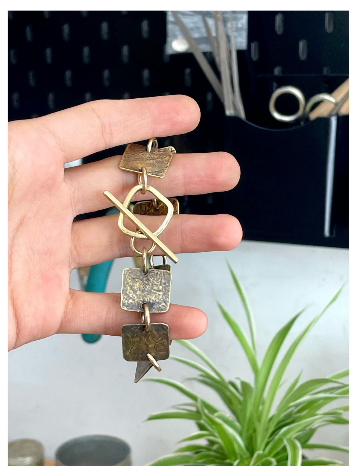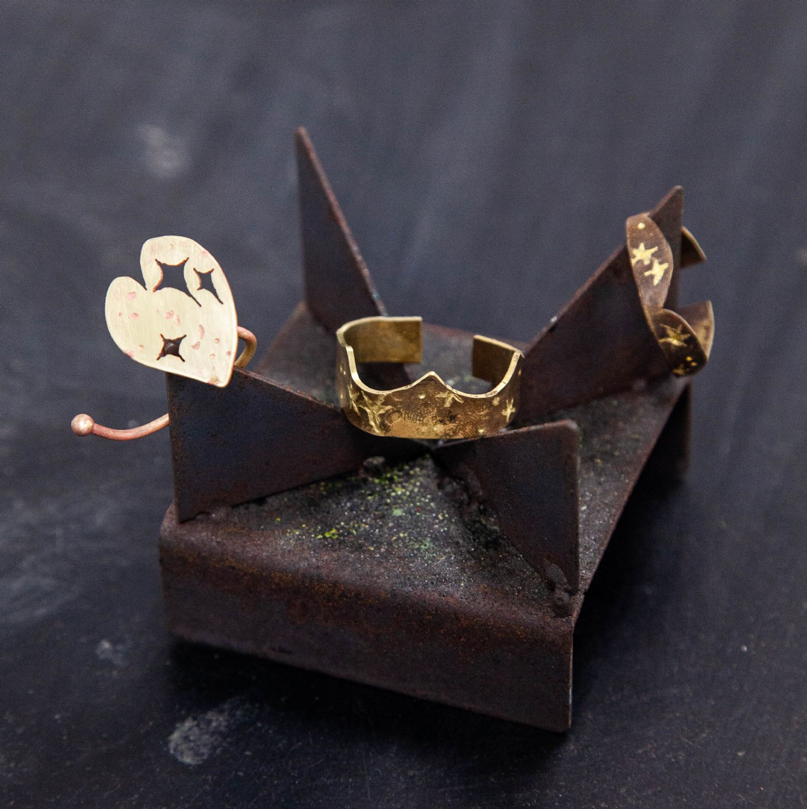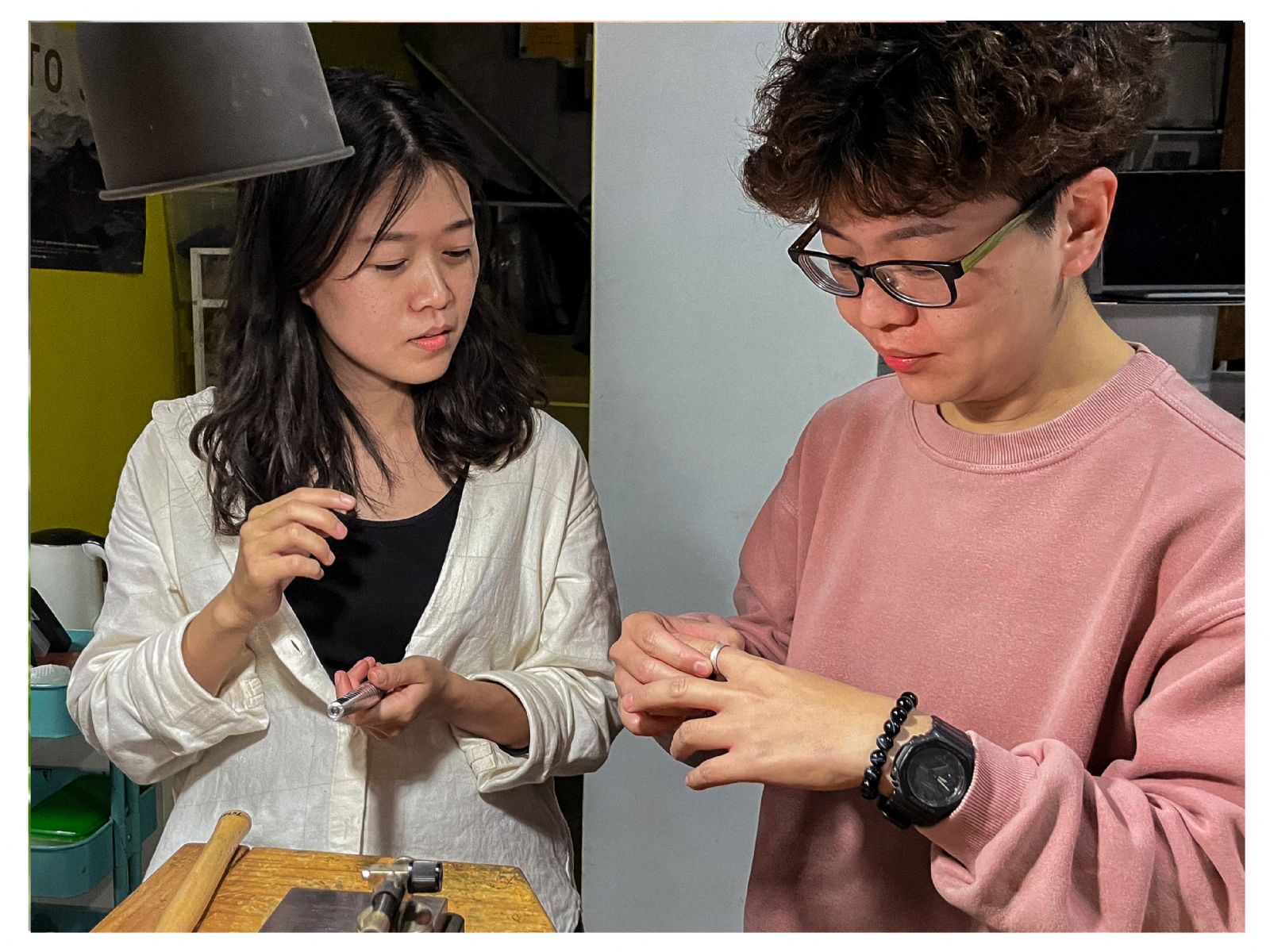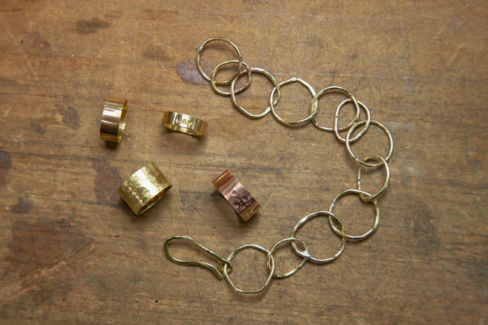 課程旨在培養學員與循序漸進引導技法的操作,熟練各項手工具操作與輔助創作構思。認識不同金屬材料特性、基本金工手工具與工作安全需知。基礎金工二著重於線材的變形與應用,課程從戒指、耳環、手鍊等首飾,學習鋸切焊、跳圈製作、表面質感、拋光處理等技法,由淺入 深學習基本結構與首飾設計,引導學員構思個人設計與實際製作。
