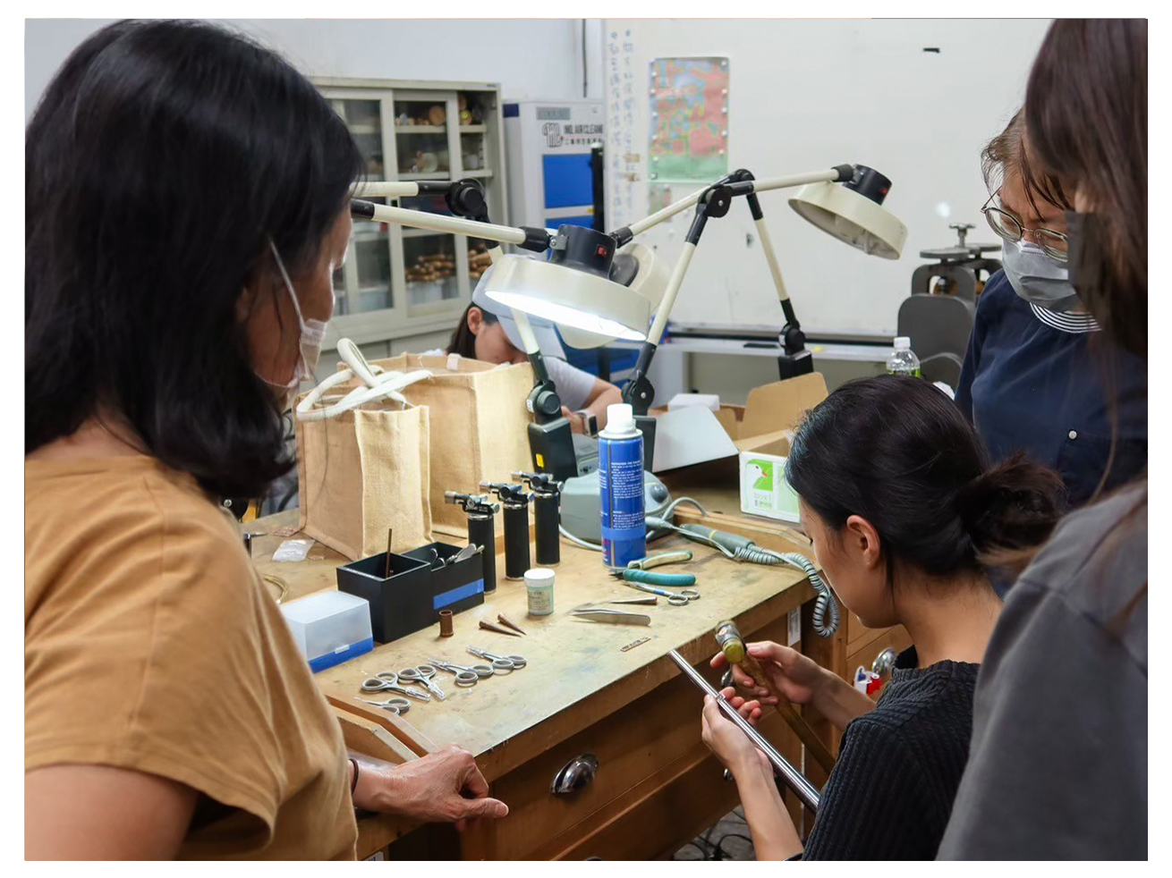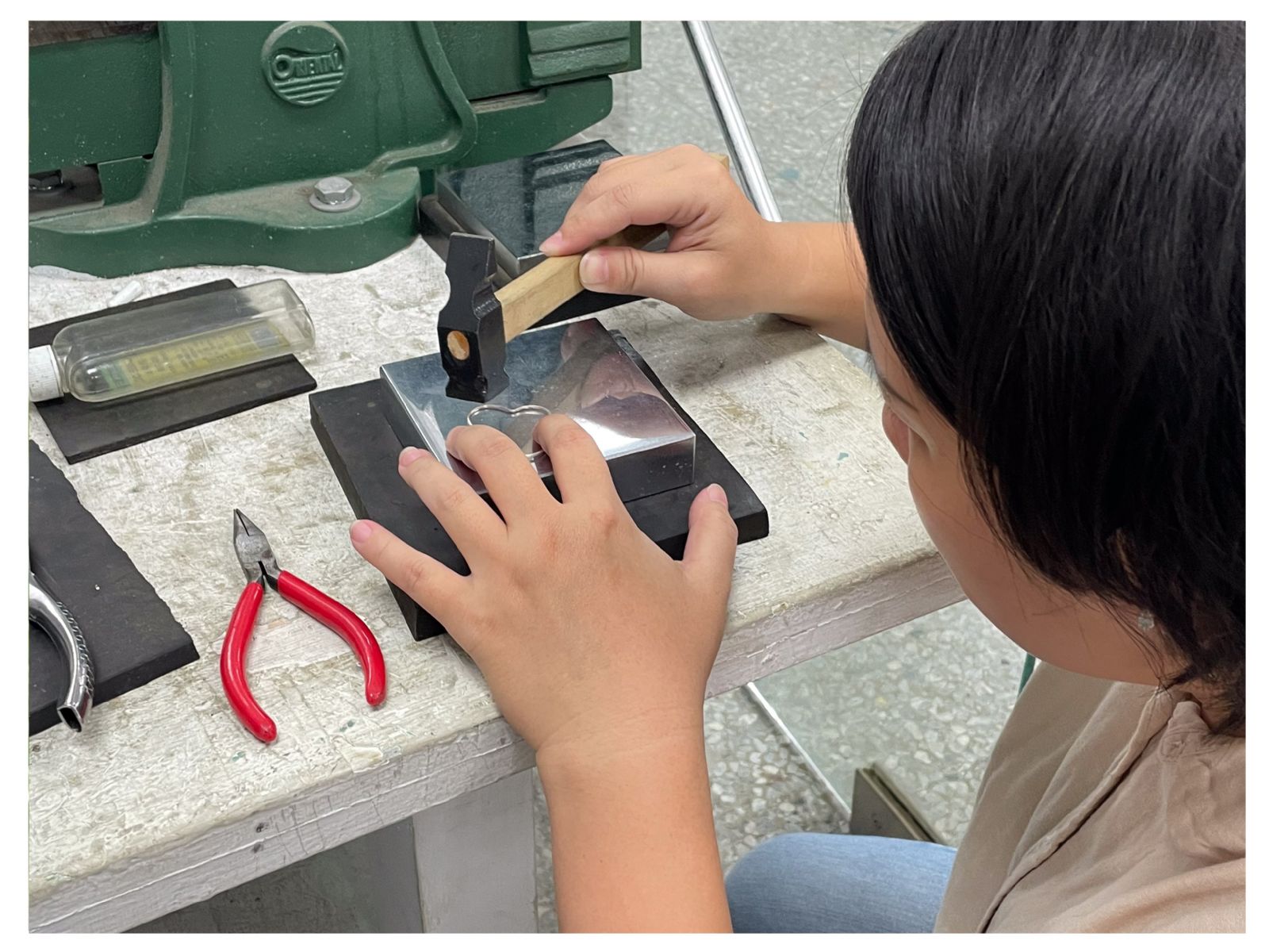 簡介課程綱要、認識⾦⼯⼯具與教室設備,瞭解⼯作安 全須知,學習使用金工槌製作質感。 |