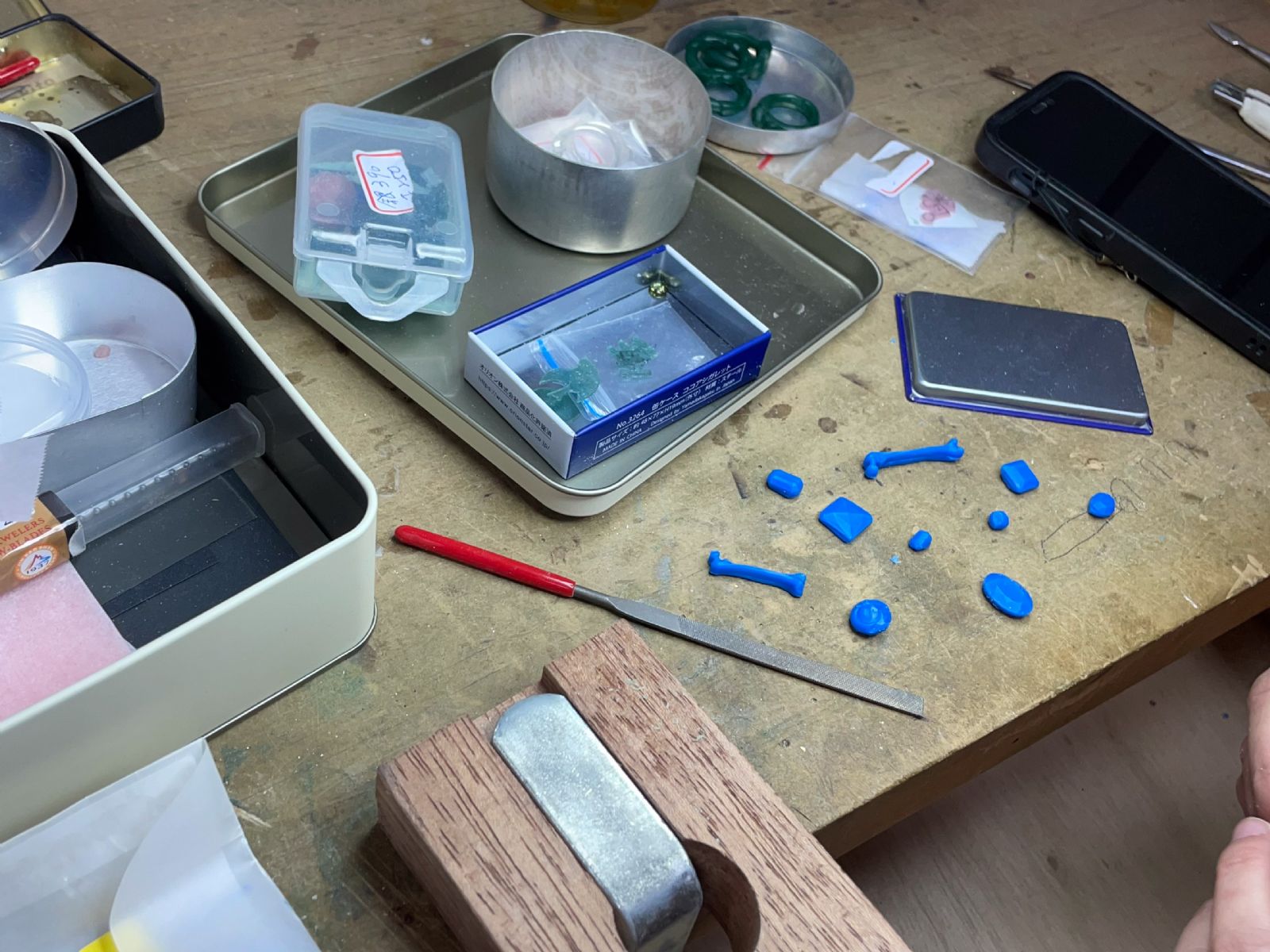簡介課程綱要、⾦⼯教室與⼯作安全須知。 認識脫蠟鑄造(Lost-wax casting)、蠟材與蠟雕⼯具介紹。介紹基礎戒型、學習戒圍測量與基本鋸切,製作印章戒、幾何戒。 |